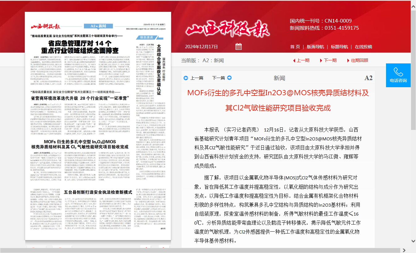 近日,山西科技报对best365官网承担的山西省基础研究计划青年项目“MOFs衍生的多孔中空型In2O3@MOS核壳异质结材料及其Cl2气敏性能研究”进行了报道。该项目由best365官网承担并得到山西省科技计划资金的支持,研究团队由马江微、雍辉等成员组成。