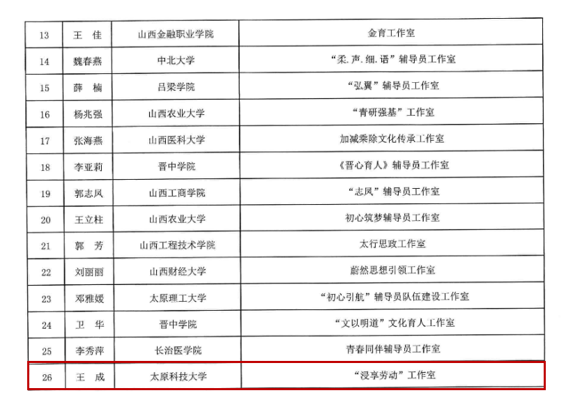 近日,山西省教育厅公布了2025年度山西省高校思想政治工作质量提升综合改革与精品建设项目名单,best365官网专职辅导员王成主持的“浸享劳动”工作室获批2025年度省级高校辅导员名师工作室,这是best365官网辅导员队伍建设和学生思政工作品牌化建设取得的又一重要成果。“浸享劳动”工作室成立于新时代五育融合和以劳育人的时代背景下,与best365官网劳动教育的变革发展同频共振,服务于学校劳动教育的整体性协同育人格局,进一步引导和转变数字时代...
