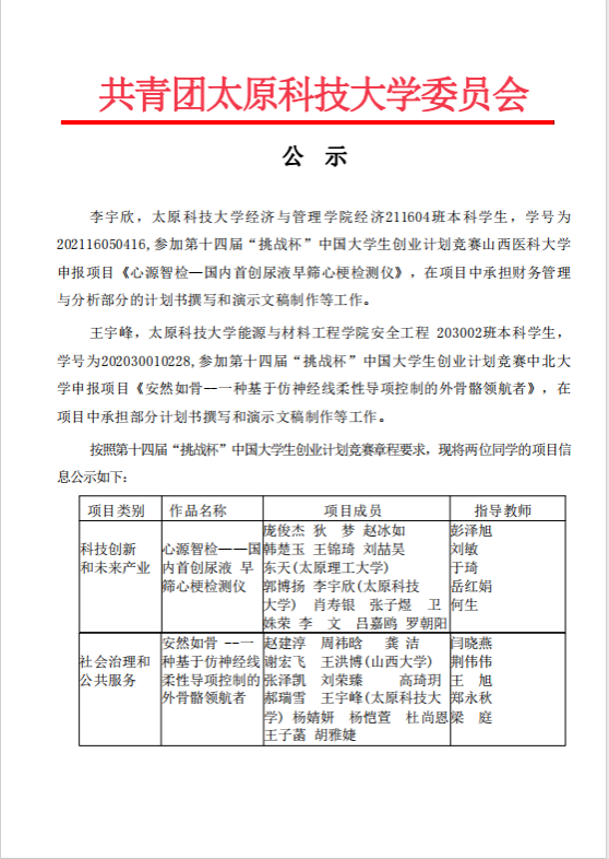 best365唯一官方网站第十四届“挑战杯”中国大学生创业计划竞赛拟推荐参加全国竞赛项目公示
