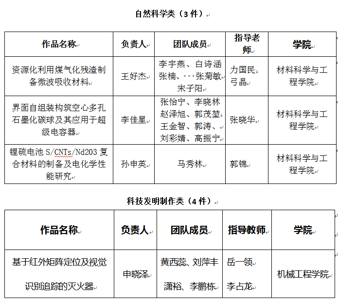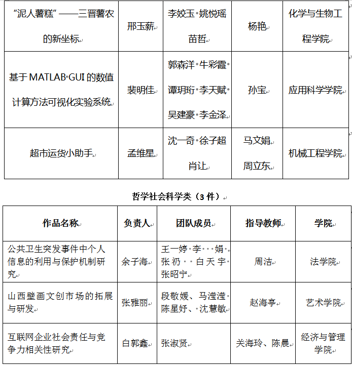按照《关于组织开展山西省第十七届“兴晋挑战杯”大学生课外学术科技作品竞赛best365唯一官方网站校级赛事的通知》,校内17位专家经过3月30日—4月1日的紧张评审,评选出best365官网晋级省赛的10件作品,现将作品名单公示如下: