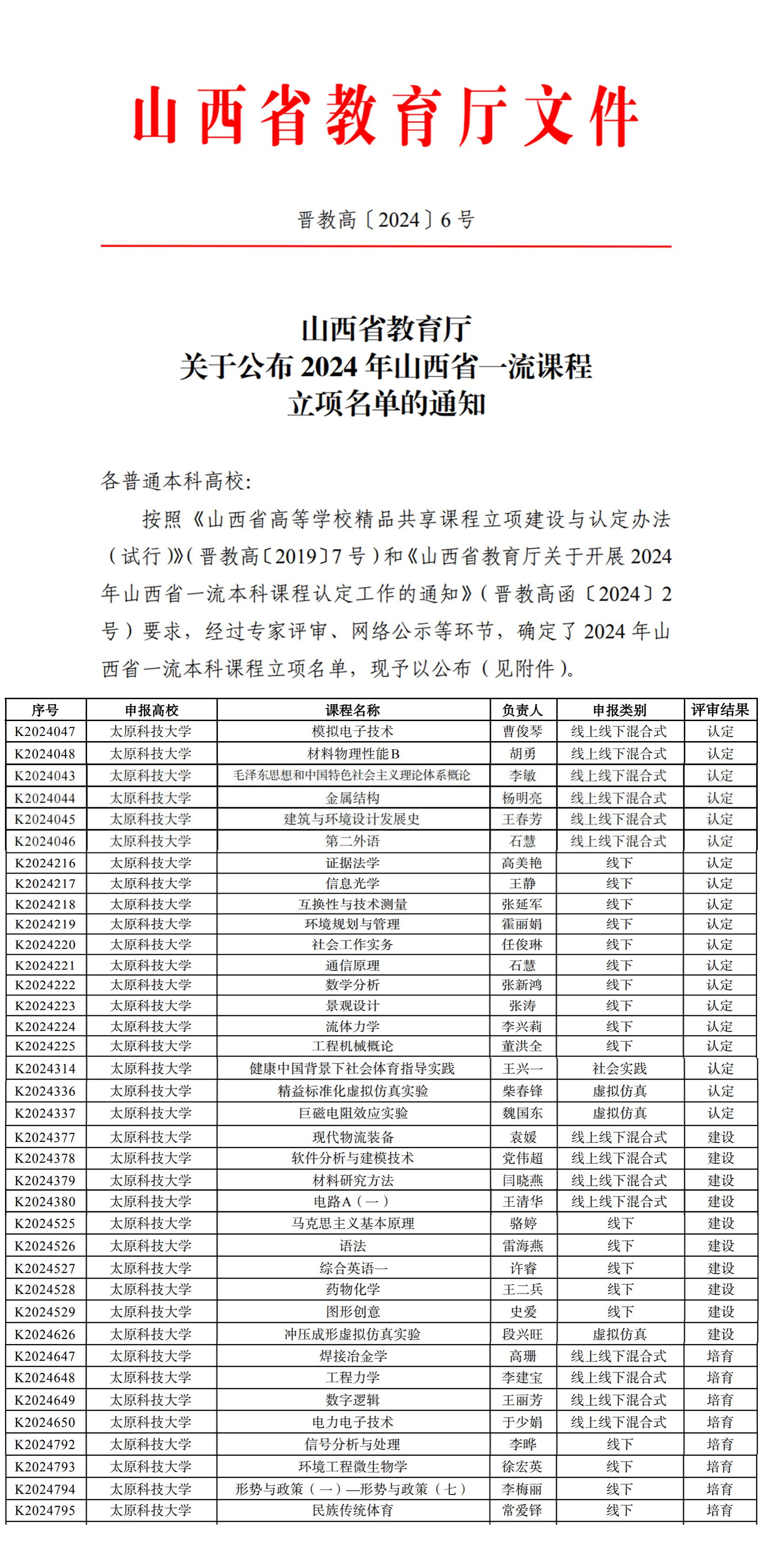 近日,山西省教育厅发布《山西省教育厅关于公布2024年山西省一流课程立项名单的通知》(晋教高〔2024〕6号),best365官网37门课程获批省级一流本科课程,其中认定课程19门(线上线下混合6门、线下10门、社会实践1门、虚拟仿真2门),建设课程10门,培育课程8门,再创佳绩。