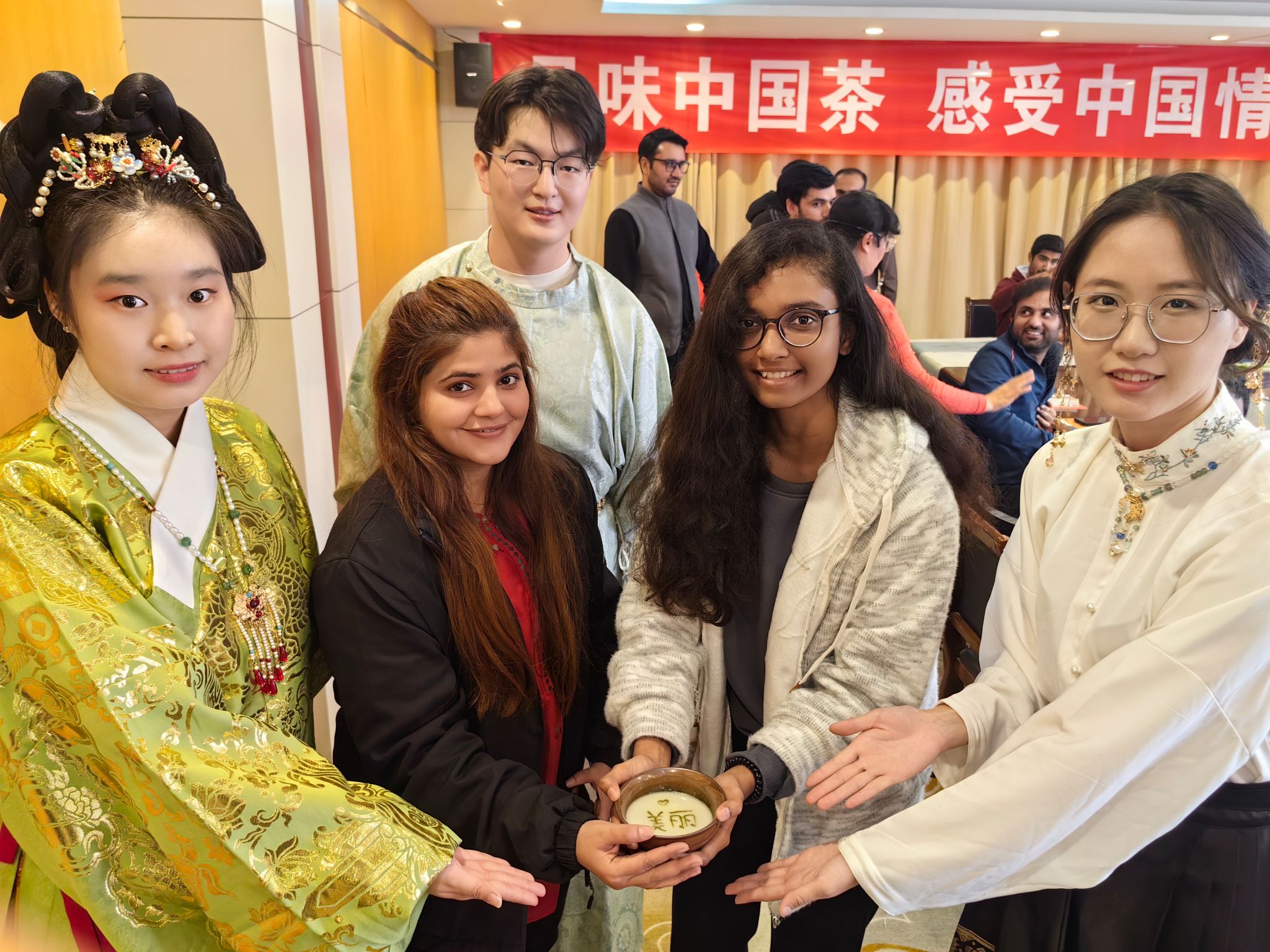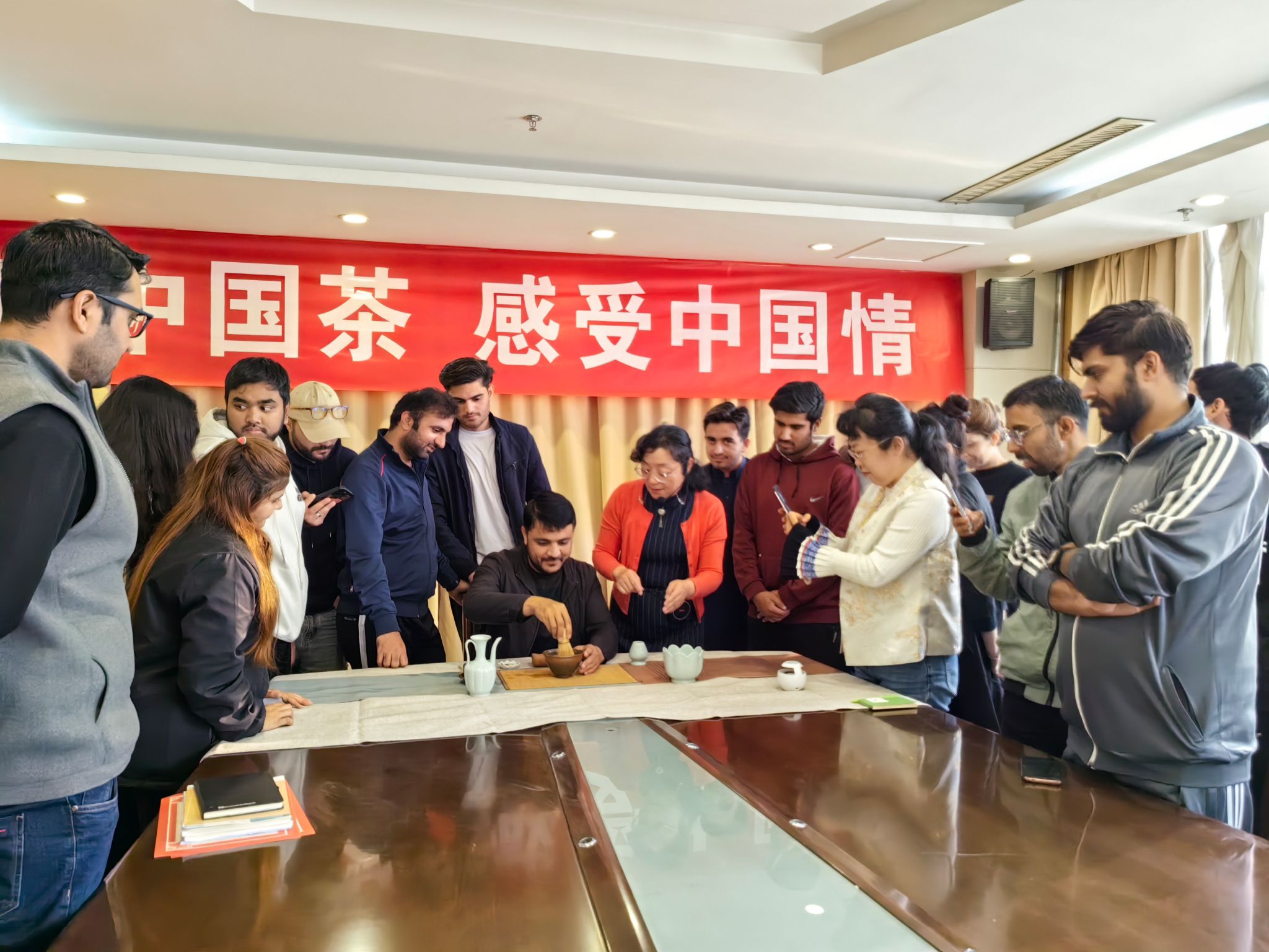此次活动以“茶道礼仪”为核心,旨在通过亲身体验的方式,让国际学生近距离感受中华文化的独特魅力。活动精心设计了“宋式点茶表演”“茶百戏体验”“现代绿茶茶道表演”和“绿茶冲泡体验”四个互动环节。在悠扬的古典音乐中,活动室内茶香四溢,学生们不仅学会了点茶、泡茶等技艺,更在品茶文化中感受到了中国茶文化的韵味与哲理。