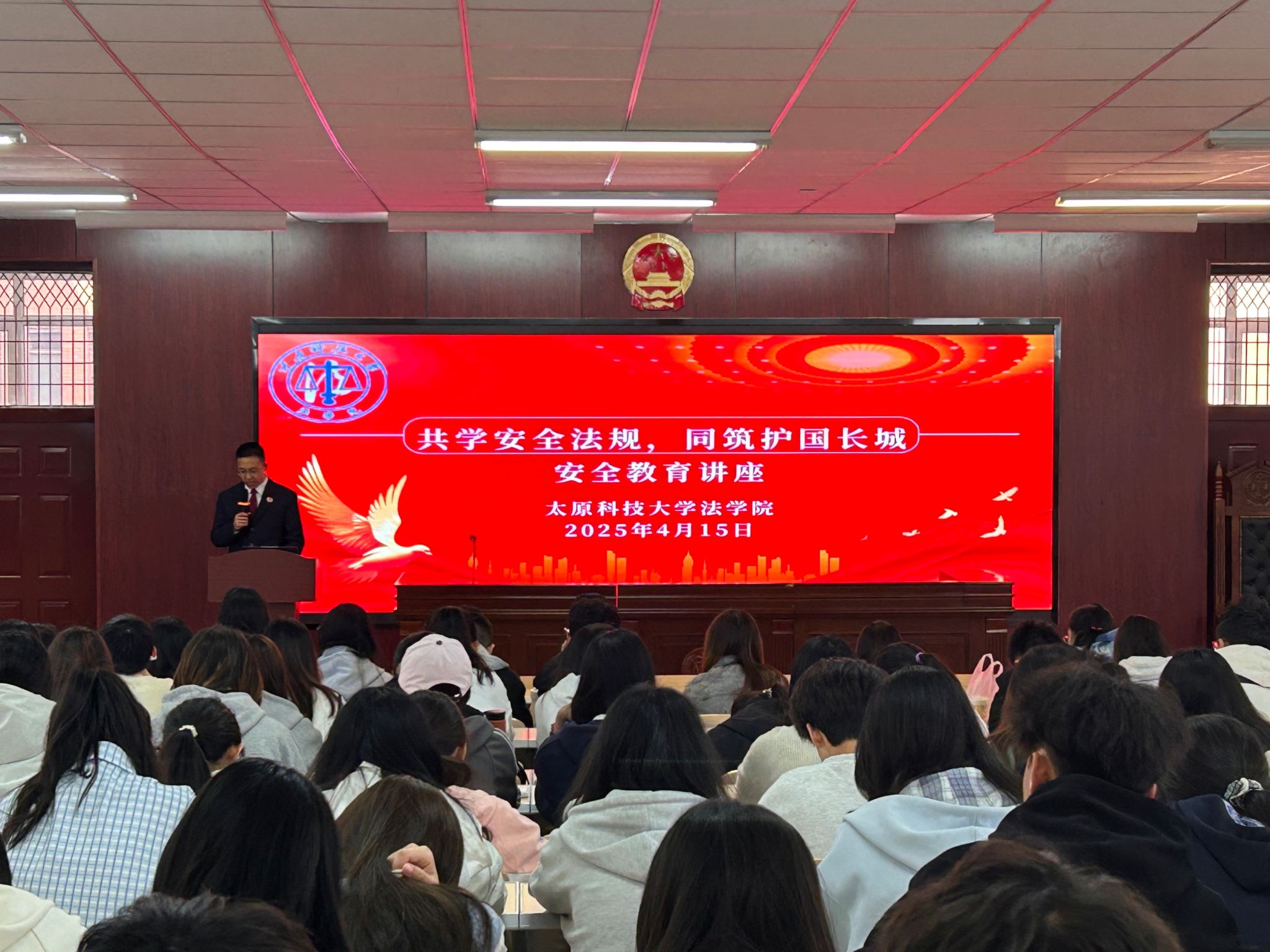 在第十个全民国家安全教育日到来之际,为深入贯彻落实总体国家安全观,提升学生法治素养和国家安全责任意识,法学院团委于4月15日上午10点在西校区力行园1号楼417室举办了“共学安全法规,同筑护国长城”国家安全教育专题讲座。本次讲座特邀万柏林区检察院检察官甄越主讲,西校区160余名学生到场聆听。