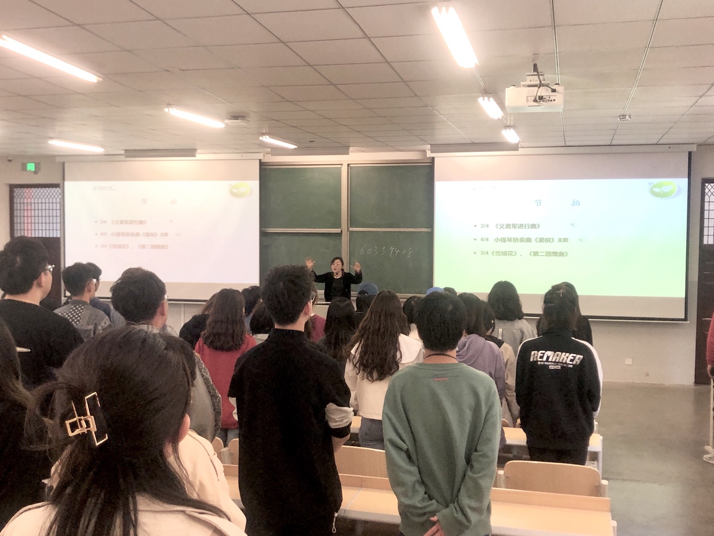 张英明老师通过分享多段音乐短片,让同学们在现场感受音乐、聆听音乐、想像“音乐”,同时鼓励大家将感受用语言表达出来。同学们对音乐的感受想象非常丰富,有的联想到险峻的高山、有的联想到清澈的小溪、有的联想到秀丽的田园、有的联想到汹涌的大海,张老师结合同学们的回答,以深入浅出的语言、形象生动的比喻进一步带领同学们走近音乐,了解音乐的美学原理与表现要素。课程中张老师组织同学们严肃而庄重的演唱《义勇军进行曲》,让大家感受音乐带来的震撼与魅力。今年正值中国共产党成立100周年,在这一伟大日子里,张老师带领同学们合唱这首歌曲,让同学们了解党史,充分感受到新中国的成立来之不易,作为21世纪的学子,更应该积极拼搏,提升自己,为我们祖国的繁荣贡献一份力量。