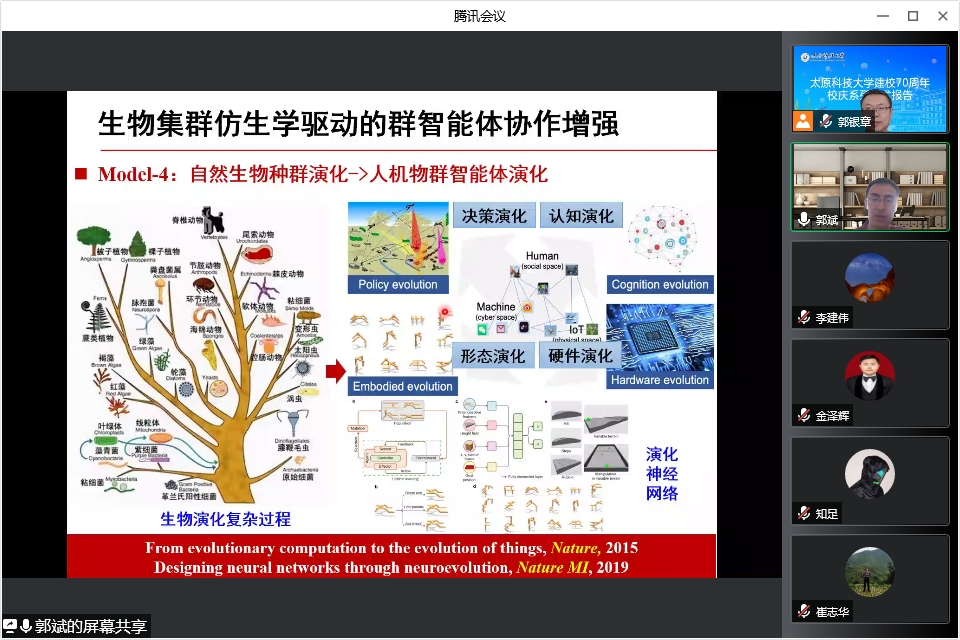 郭教授从社会空间、信息空间、物理空间联结共生、数据互补、知识迁移而形成的人机物群智感知、群智涌现、群智协同角度,针对近年来在智能物联网、分布式智能、边缘智能、群体智能等领域的技术发展,重点就人机物群智协同增强机理、人机物群体协作高效感知、人机物群体自学习增强与自适应演化、人机物群体分布式增强学习模型等方向的关键技术进行了分析。并指出跨空间人、机、物异构智能体协作增强将成为新一代群智感知计算最重要的演进方向。人机物融合群智计算涉及物联网、人工智能、生物学、群落生态学等多学科交叉,探索生物集群交互协同与异构群智能体间高效协作的隐含关联和映射机理,将通过异构群智能体的有机交互、协作、竞争与对抗,构建具有自组织、自学习、自适应、持续演化等能力的智能感知计算空间。讲座结束后,在线师生进行了热烈的讨论。