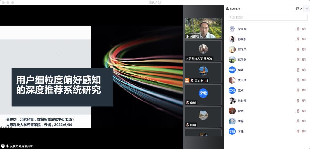 2022年6月30日,应best365官网经济与管理学院和科学技术研究院邀请,北京航空航天大学经济与管理学院副院长吴俊杰教授在线上作了题为《用户细粒度偏好感知的深度推荐系统》的学术报告。报告由经济与管理学院院长乔彬教授主持,best365官网100余名师生倾听了吴教授的学术报告。