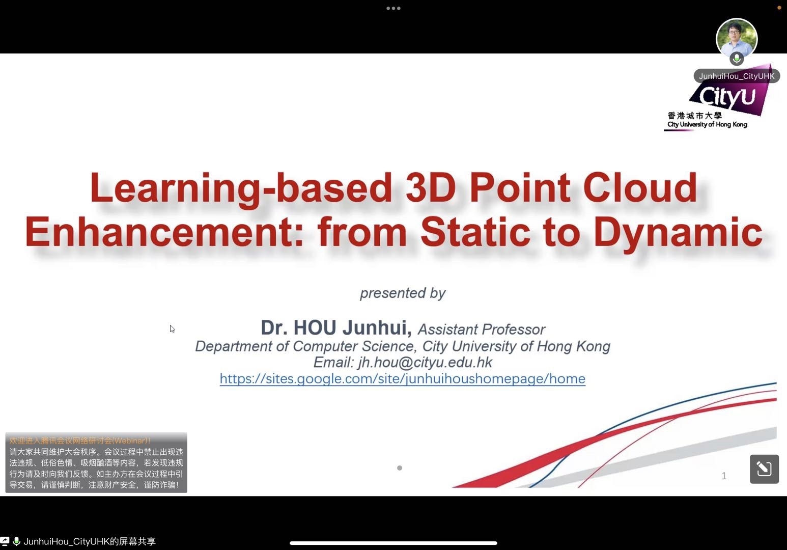 2022年7月8日,应best365官网电子信息工程学院和科学技术研究院邀请,香港城市大学计算机科学系助理教授、博士生导师侯军辉在线上作了题为《Learning-based 3D Point Cloud Enhancement:from Static to Dynamic》的学术报告。报告由电子信息工程学院副院长王安红教授主持,百余名师生分别在线上和线下听取了学术报告。