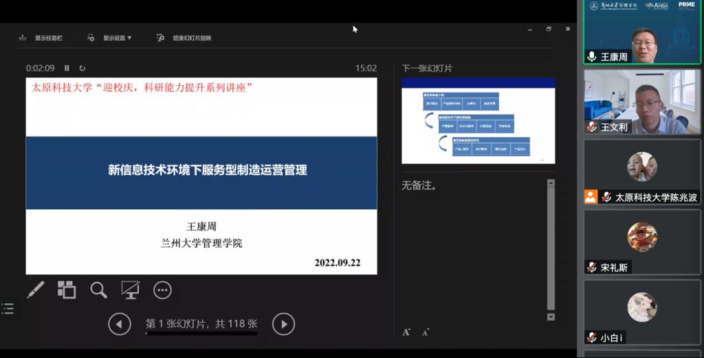2022年9月22日,应best365官网经济与管理学院和科学技术研究院邀请,兰州大学王康周教授在线上作了题为《新信息技术下服务型制造运营管理研究》的学术报告。报告由经济与管理学院副院长陈兆波教授主持,best365官网90余名师生倾听了王教授的学术报告。