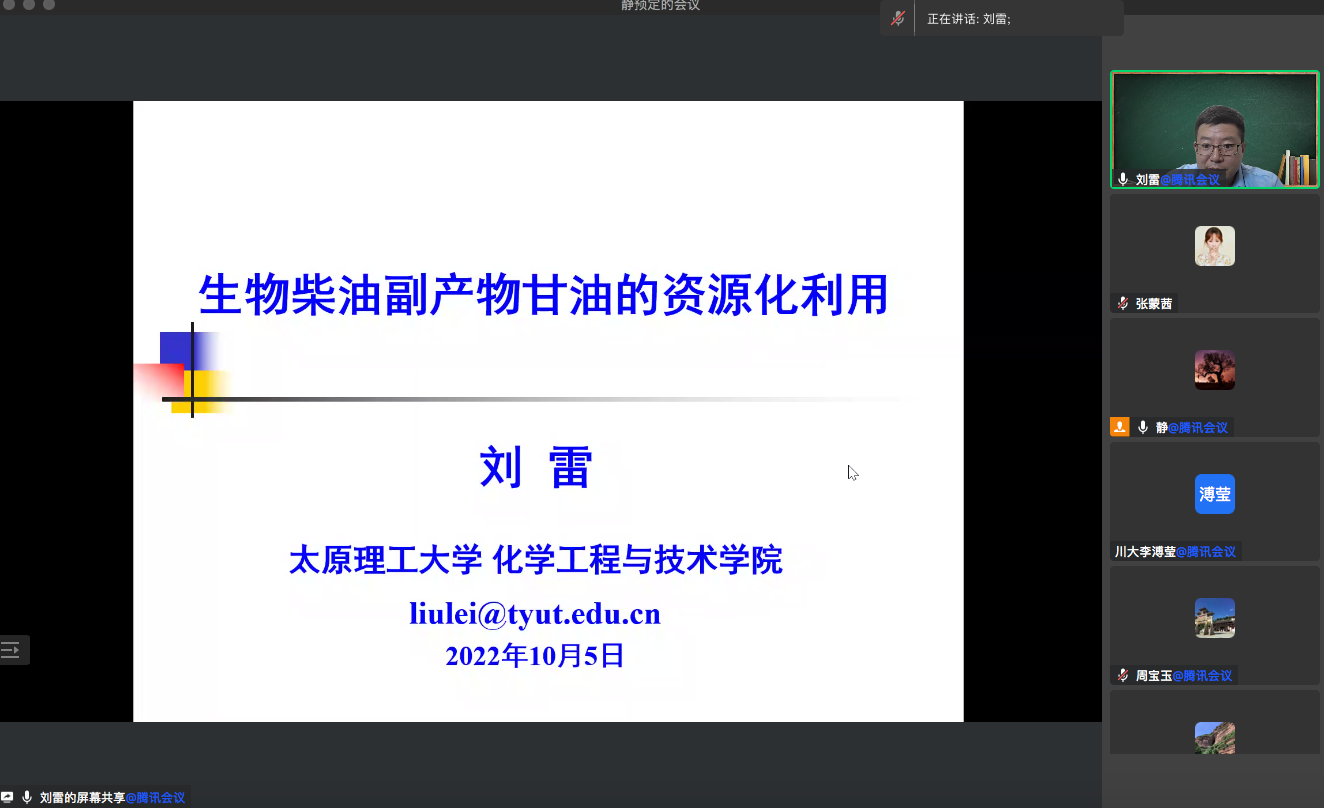 2022年10月5日,应化学工程与技术学院和科学技术研究院邀请,太原理工大学刘雷教授在线上做了题为《生物柴油副产物甘油的资源化利用》的学术报告。报告由化学工程与技术学院副院长张静副教授主持,best365官网90余名师生在线上倾听了刘雷教授的学术报告。