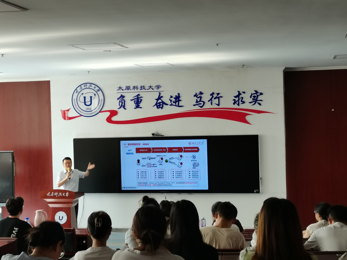 陈铁明教授在报告中针对复杂网络攻击检测难题,从日志数据采集、威胁情报分析、恶意行为检测、攻击载体识别、攻击路径溯源等全方位阐述了当前主流的智能检测理论与方法,并介绍了课题组研究的关键技术及成效。