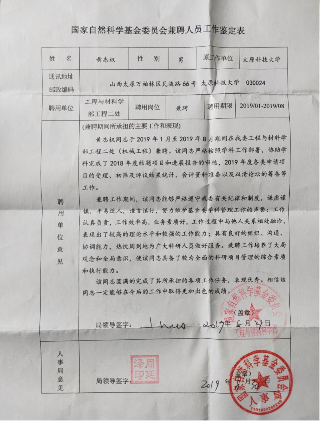 2019年1月-2019年8月,受学校委派,前往国家自然科学基金委员会挂职。在为期8个月的兼聘工作中,接受了国家部委党建、纪律和制度的培训,培养了大局观念和全局意识,同时接受了基金申报受理、初筛、评议结果统计等高强度工作的训练,出色的完成了学部的工作并得到充分肯定,使其具备了较为全面的科研项目管理综合素质和执行能力。在我院2020、2021年基金申报工作中,利用节假日对每一份项目申报书撰写格式、规范性等提出了良好的建议和修改意见。