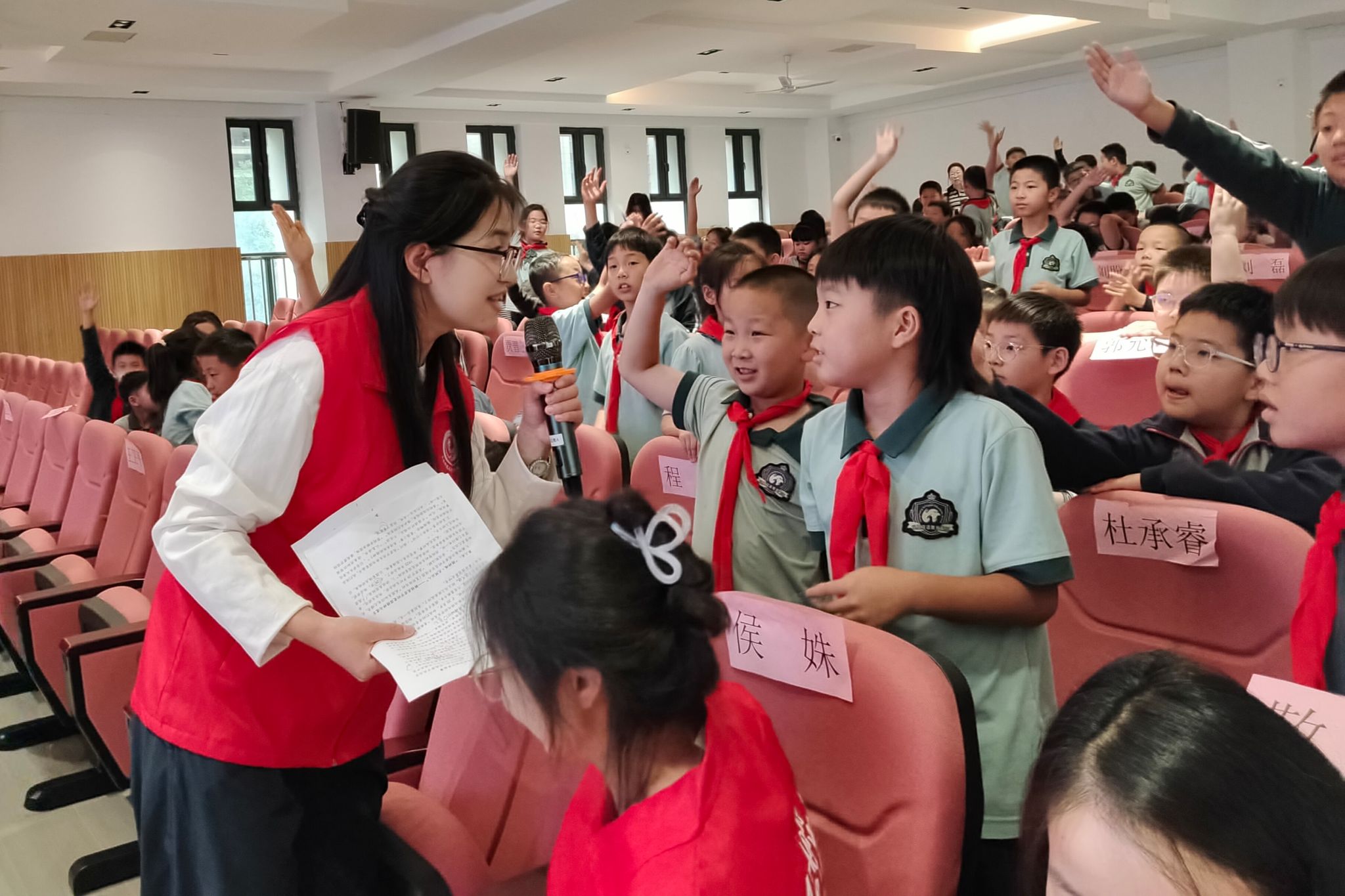 宣讲团成员分别以《传君宇精神,做爱国少年》《铭记历史:从大寨故事里学奋斗》为主题,将宏大的价值观转化为儿童语言和互动活动。通过设计“少年志”“革命行”“精神魂”三道关卡与“精神对对碰”小游戏,借助历史场景图、相关影像资料、名言手迹等,让同学们在沉浸式互动体验中既铭记“九一八”的历史警示,又感悟革命先辈的家国情怀,进一步激发了同学们将爱国情、奋斗志融入日常学习与生活的内在动力,让红色基因与奋斗精神在孩子们幼小的心灵里扎根生长。