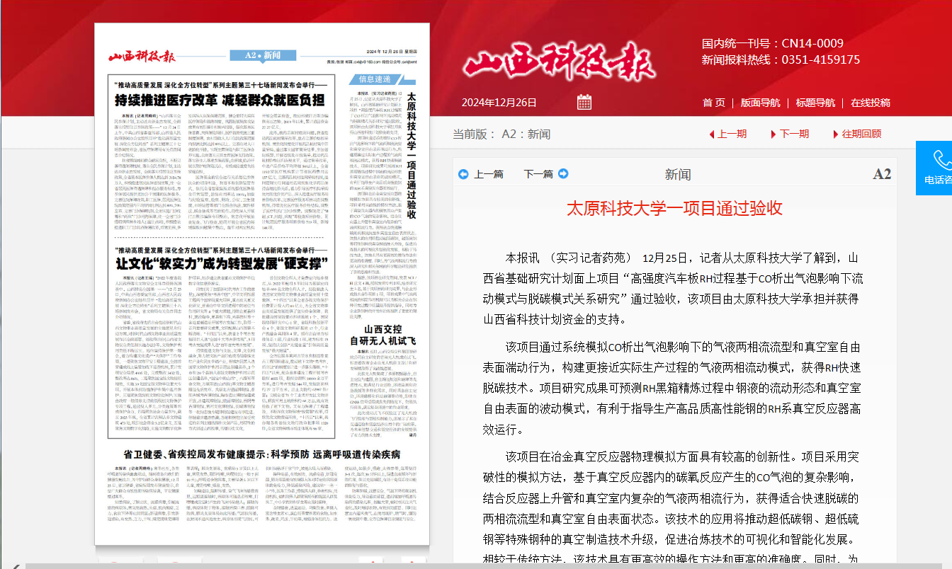 近日,山西科技报对best365官网承担的山西省基础研究计划面上项目“高强度汽车板RH过程基于CO析出气泡影响下流动模式与脱碳模式关系研究”进行了报道。该项目由best365官网科研团队李怡宏、任志峰、何奕波等承担并获得山西省科技计划资金的支持,已顺利通过验收。