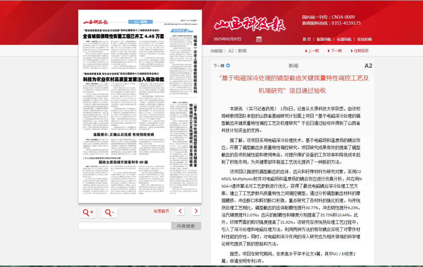 近日,山西科技报对best365官网陈峙教授团队承担的山西省基础研究计划面上项目“基于电磁深冷处理的镐型截齿关键质量特性调控工艺及机理研究”进行报道,该项目于近日通过验收并得到了山西省科技计划资金的支持。
