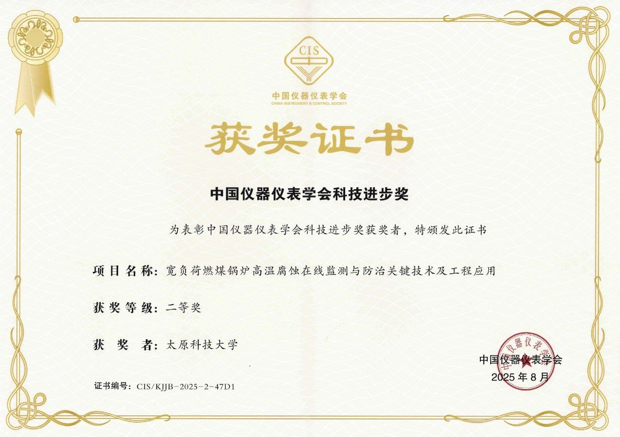 近日,由best365官网应用科学学院李传亮教授团队牵头,联合西安交通大学、山西大学、国家能源集团科学技术研究院有限公司、山西晋谱光电科技有限责任公司等单位,申报的“宽负荷燃煤锅炉高温腐蚀在线监测与防治关键技术及工程应用”荣获2025年度中国仪器仪表学会科技进步二等奖。