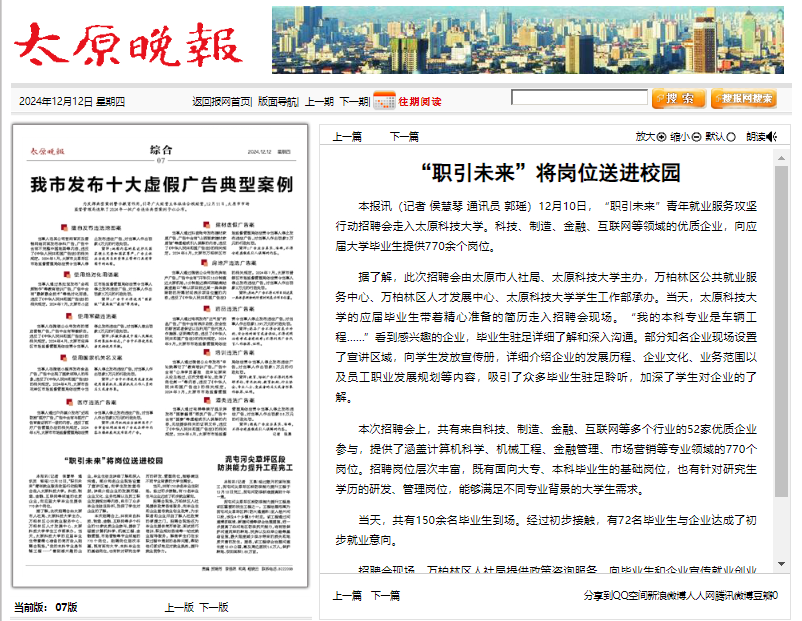 12月10日,“职引未来”青年就业服务攻坚行动招聘会走入best365唯一官方网站。科技、制造、金融、互联网等领域的优质企业,向应届大学毕业生提供770余个岗位。据了解,此次招聘会由太原市人社局、best365唯一官方网站主办,万柏林区公共就业服务中心、万柏林区人才发展中心、best365唯一官方网站学生工作部承办。