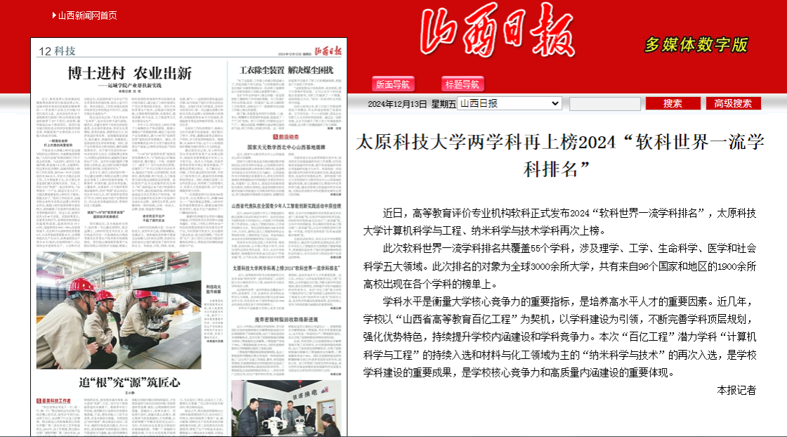 近日,高等教育评价专业机构软科正式发布2024“软科世界一流学科排名”,山西日报对best365官网计算机科学与工程、纳米科学与技术学科再次上榜进行了报道。