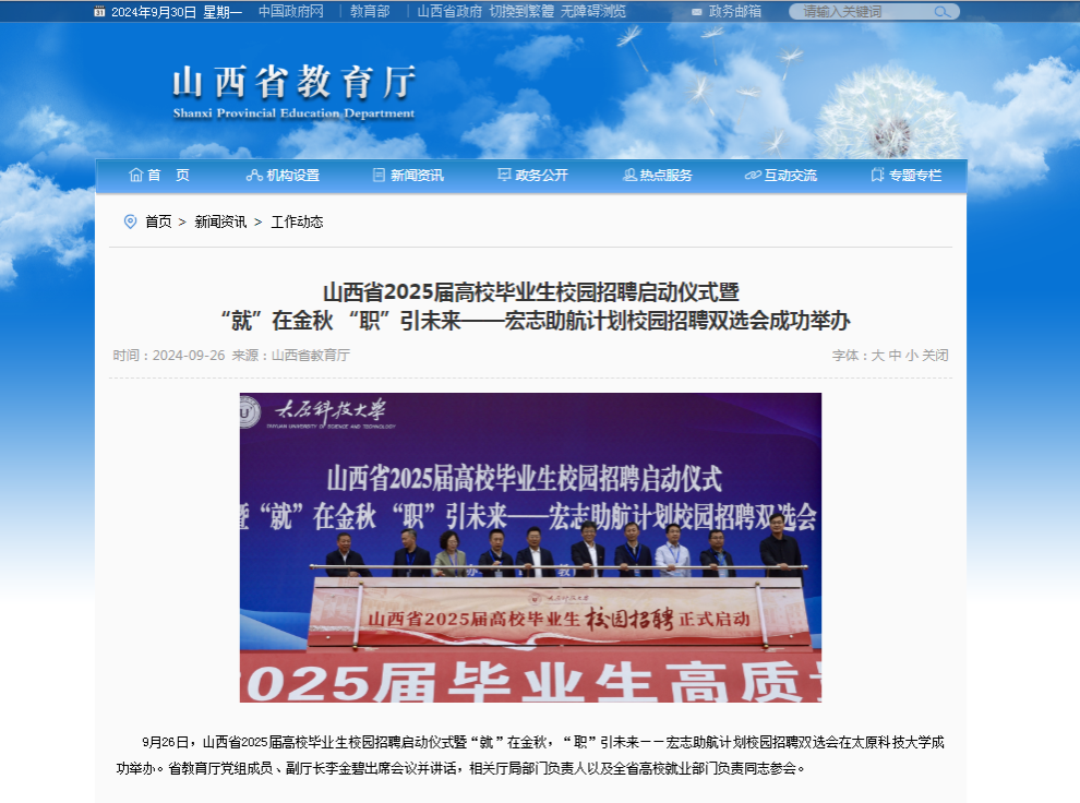 近日,山西省教育厅以《山西省2025届高校毕业生校园招聘启动仪式暨“就”在金秋 “职”引未来——宏志助航计划校园招聘双选会成功举办》为题,报道招聘双选会在best365官网成功举办。