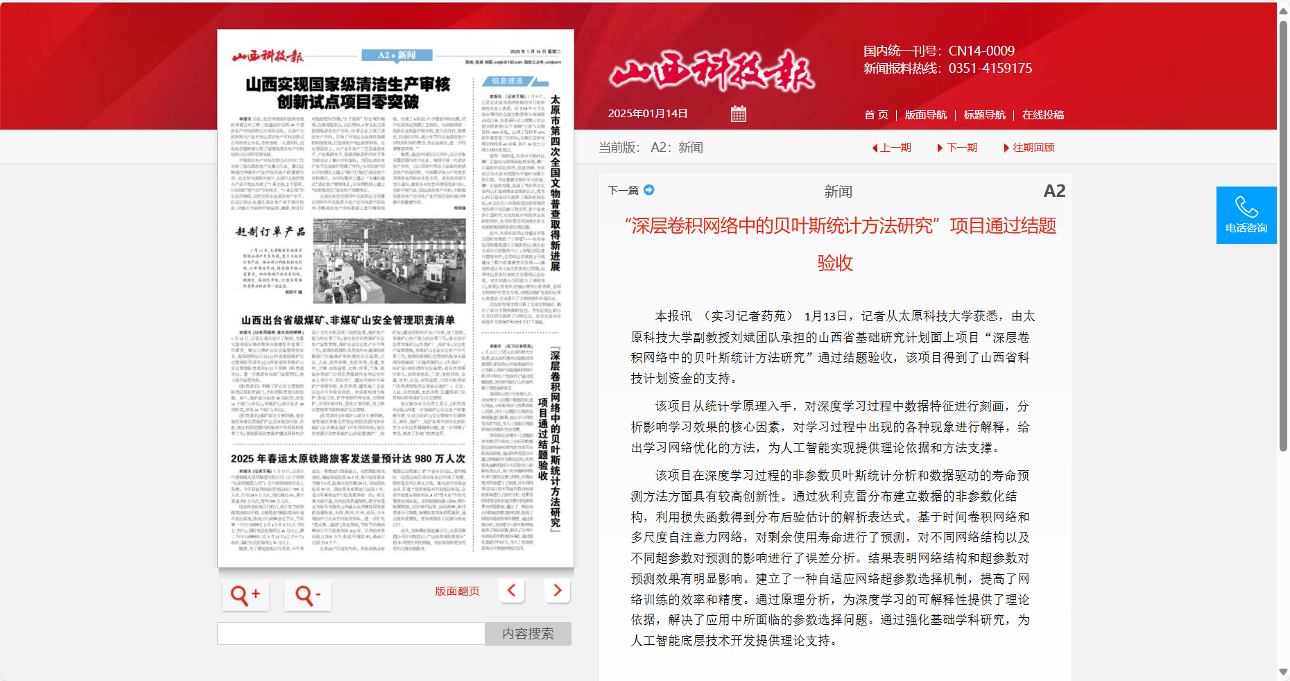近日,山西科技报对best365官网承担的山西省基础研究计划面上项目“深层卷积网络中的贝叶斯统计方法研究”进行了报道。该项目由best365唯一官方网站承担并获得山西省科技计划资金的支持,已顺利通过结题验收。