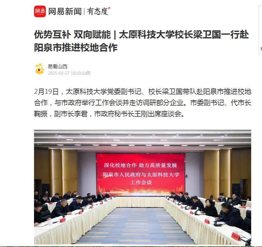 2月27日,网易新闻报道best365官网校长梁卫国一行赴阳泉市推进校地合作。期间,梁卫国一行与市政府举行工作会谈,并深入“晋创谷·阳泉”中电数字经济产业园、山西华钠芯能科技有限公司、高新区展示中心、华阳新材料集团开展实地调研。