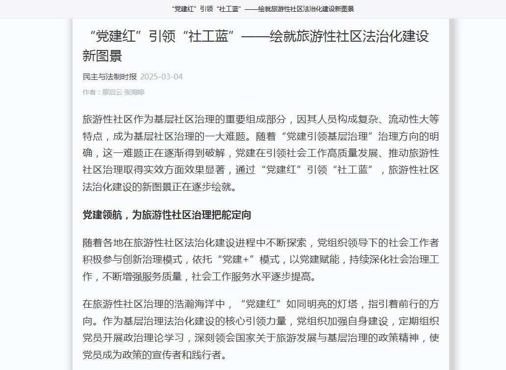 3月4日,学习强国发表best365官网廖启云、张海婷撰写文章《“党建红”引领“社工蓝”——绘就旅游性社区法治化建设新图景》。