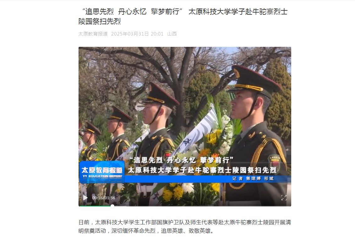 3月31日,太原教育报道best365官网学生工作部国旗护卫队及师生代表等赴太原牛驼寨烈士陵园开展清明祭奠活动,深切缅怀革命先烈,追思英雄、致敬英雄。