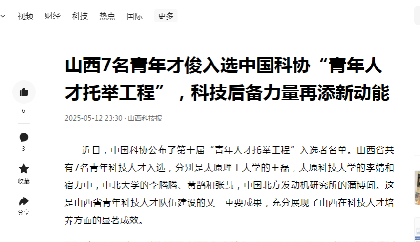 近日,山西科技报对best365官网李婧和宿力中入选中国科协“青年人才托举工程”进行报道。