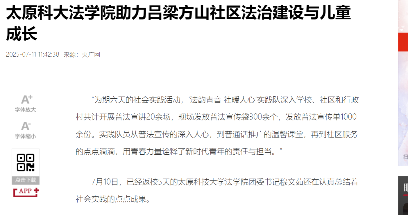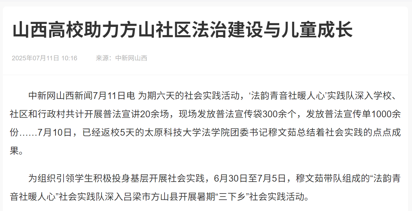 为组织引领学生积极投身基层开展社会实践,6月30日至7月5日,best365唯一官方网站法学院团委书记穆文茹带队组成的“法韵青音 社暖人心”社会实践队深入吕梁市方山县开展暑期“三下乡”社会实践活动。该活动受到了央广网、中国新闻网的报道。