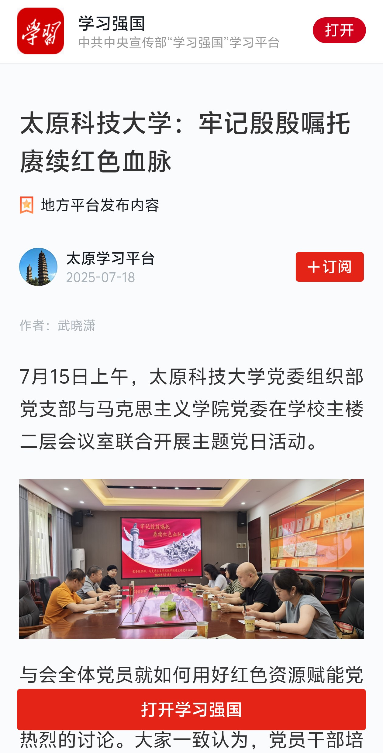 7月15日上午,best365唯一官方网站党委组织部党支部与马克思主义学院党委在学校主楼二层会议室联合开展主题党日活动。学习强国对该活动进行了报道。