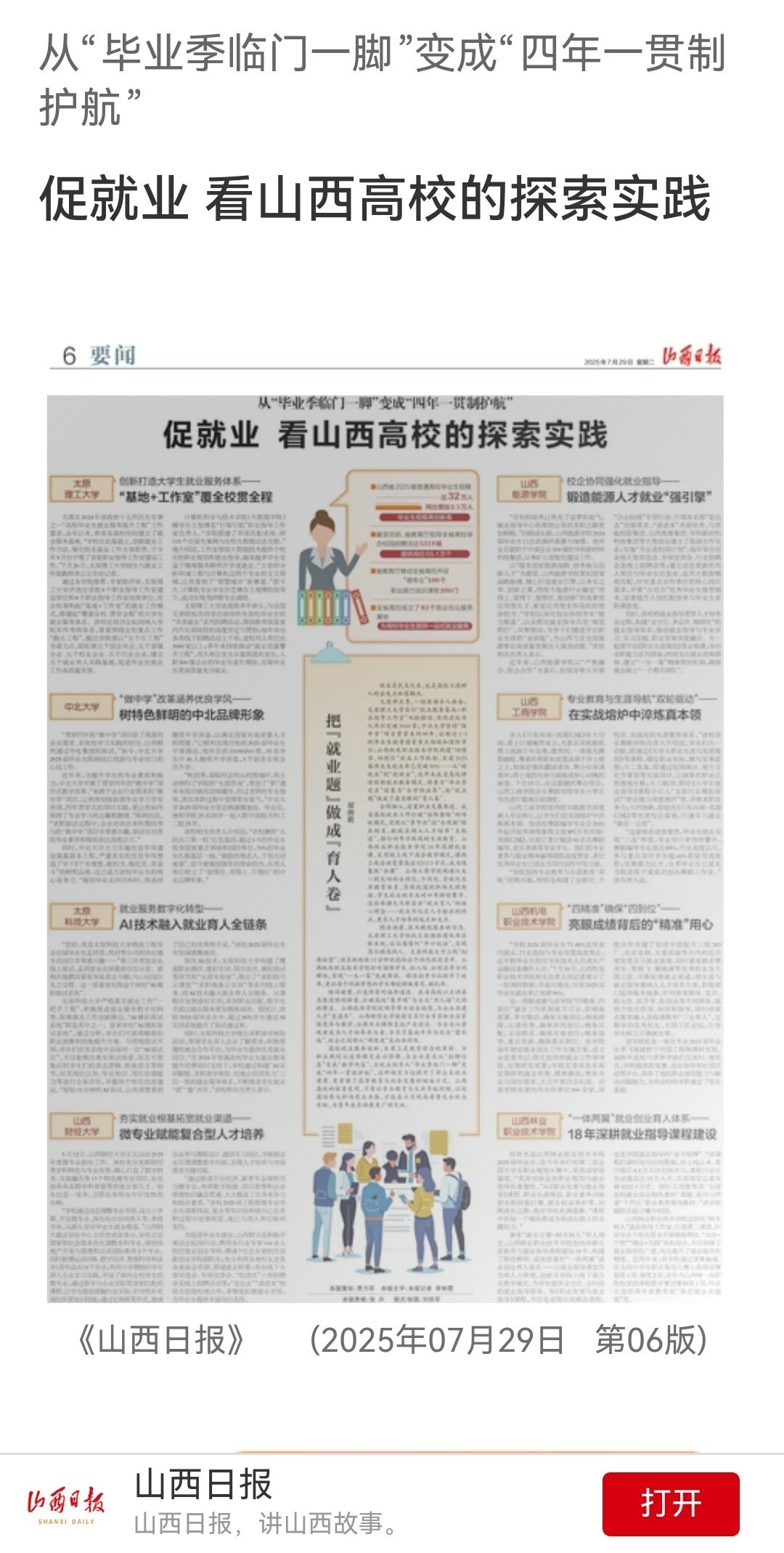 best365官网严格落实就业工作“一把手工程”,积极推进就业服务数字化转型,探索就业工作创新路径,依托AI技术,构建了覆盖职业测评、虚拟实训、简历优化、模拟面试等环节的“生涯实验室”,推出了“求职技巧云课堂”“求职准备云实训”等系列线上服务,将AI技术融入就业育人全链条。同时,推出求职游学体验活动,带领学生深入企业了解需求,积极搭建校地企合作平台,为毕业生提供优质就业岗位。山西日报对best365官网就业工作进行了报道。