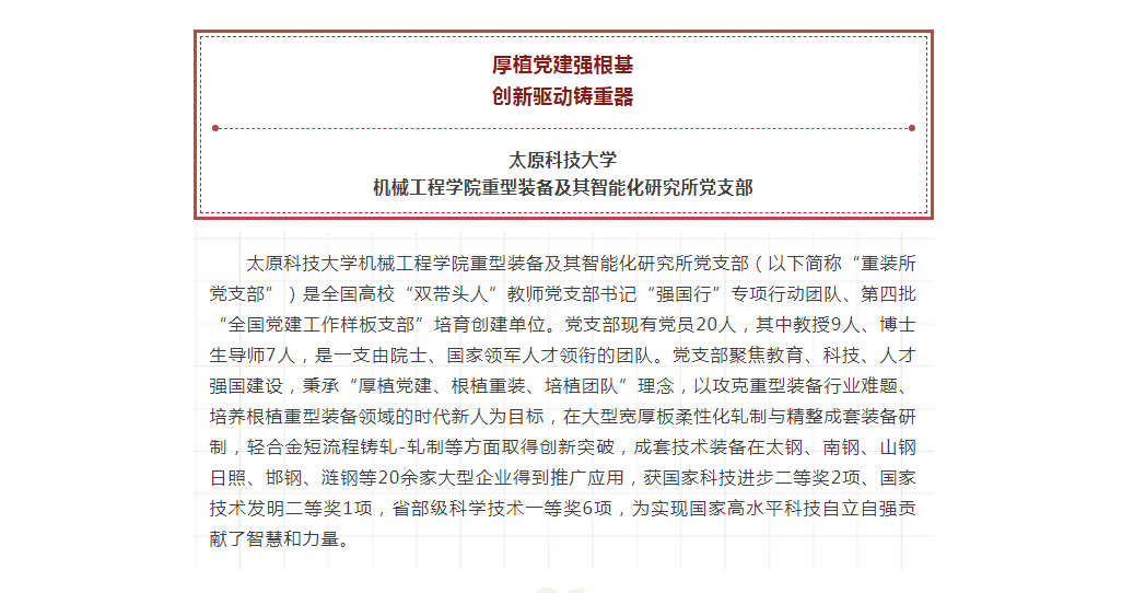 best365唯一官方网站机械工程学院重型装备及其智能化研究所党支部(以下简称“重装所党支部”)是全国高校“双带头人”教师党支部书记“强国行”专项行动团队、第四批“全国党建工作样板支部”培育创建单位。党支部现有党员20人,其中教授9人、博士生导师7人,是一支由院士、国家领军人才领衔的团队。党支部聚焦教育、科技、人才强国建设,秉承“厚植党建、根植重装、培植团队”理念,以攻克重型装备行业难题、培养根植重型装备领域的时代新人为目标,在大型宽厚板柔性化轧制与精整成套装备研制,轻合金短流程铸轧-轧制等方面取得创新突破,成套技术装备在太钢、南钢、山钢日照、邯钢、涟钢等20余家大型企业得到推广应用,获国家科技进步二等奖2项、国家技术发明二等奖1项,省部级科学技术一等奖6项,为实现国家高水平科技自立自强贡献了智慧和力量。全国高校思想政治工作网对best365官网该党支部进行了报道。