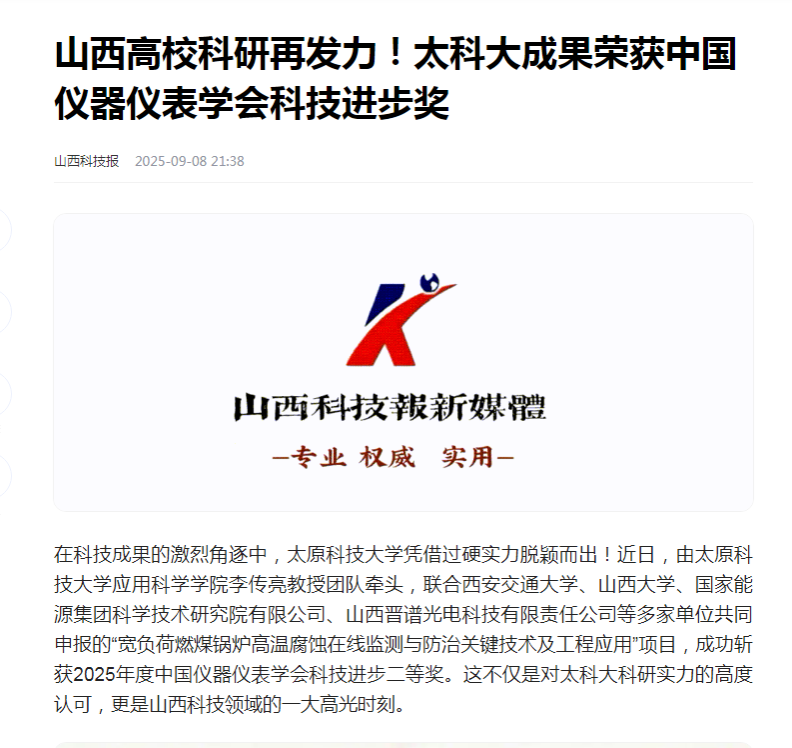 近日,由best365唯一官方网站应用科学学院李传亮教授团队牵头,联合西安交通大学、山西大学、国家能源集团科学技术研究院有限公司、山西晋谱光电科技有限责任公司等多家单位共同申报的“宽负荷燃煤锅炉高温腐蚀在线监测与防治关键技术及工程应用”项目,成功斩获2025年度中国仪器仪表学会科技进步二等奖。