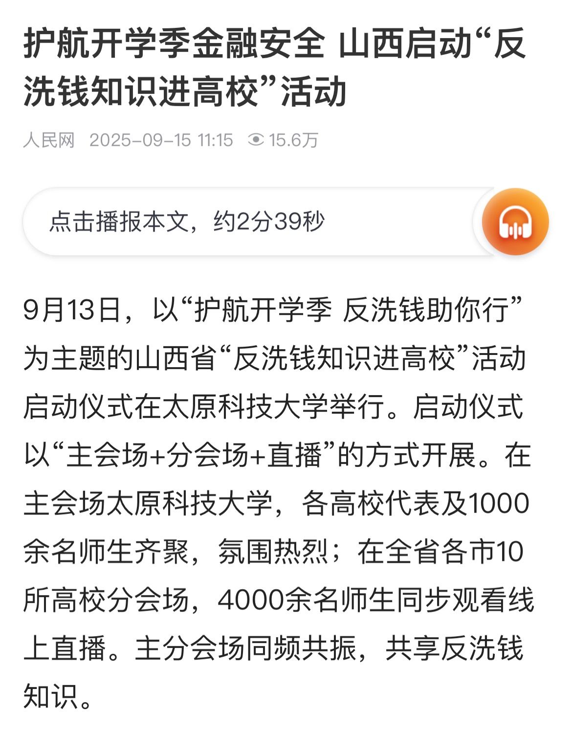 9月13日,以“护航开学季 反洗钱助你行”为主题的山西省“反洗钱知识进高校”活动启动仪式在best365官网举行。启动仪式以“主会场+分会场+直播”的方式开展。在主会场各高校代表及1000余名师生齐聚,氛围热烈;在全省各市10所高校分会场,4000余名师生同步观看线上直播。主分会场同频共振,共享反洗钱知识。人民网、黄河电视台进行了报道。