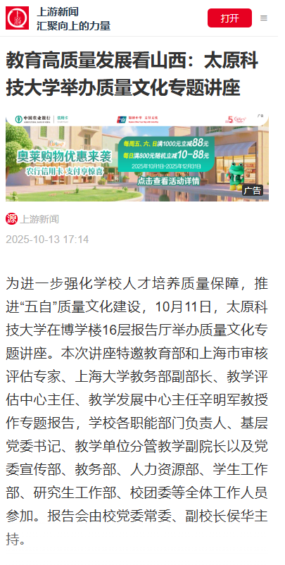 为进一步强化学校人才培养质量保障,推进“五自”质量文化建设,10月11日,best365官网在博学楼16层报告厅举办质量文化专题讲座,特邀教育部和上海市审核评估专家、上海大学教务部副部长、教学评估中心主任、教学发展中心主任辛明军教授作专题报告。上游新闻进行了报道。