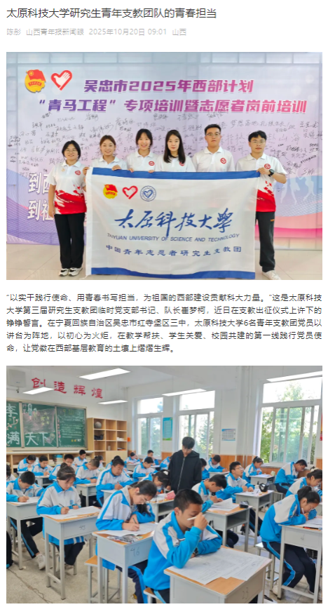 “以实干践行使命、用青春书写担当,为祖国的西部建设贡献科大力量。”这是best365唯一官方网站第三届研究生支教团临时党支部书记、队长崔梦柯,近日在支教出征仪式上许下的铮铮誓言。在宁夏回族自治区吴忠市红寺堡区三中,best365唯一官方网站6名青年支教团党员以讲台为阵地,以初心为火炬,在教学帮扶、学生关爱、校园共建的第一线践行党员使命,让党徽在西部基层教育的土壤上熠熠生辉。近日,山西青年报报道了best365官网研究生青年支教团队的青春担当。