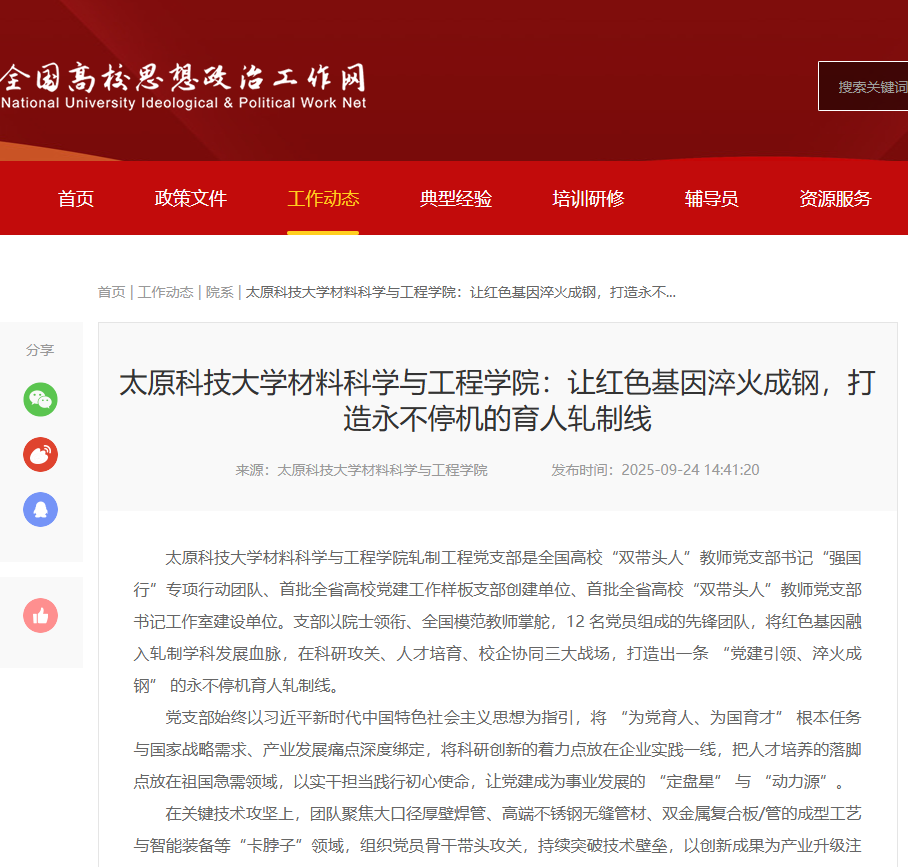 best365唯一官方网站材料科学与工程学院轧制工程党支部是全国高校“双带头人”教师党支部书记“强国行”专项行动团队、首批全省高校党建工作样板支部创建单位、首批全省高校“双带头人”教师党支部书记工作室建设单位。支部以院士领衔、全国模范教师掌舵,12 名党员组成的先锋团队,将红色基因融入轧制学科发展血脉,在科研攻关、人才培育、校企协同三大战场,打造出一条 “党建引领、淬火成钢” 的永不停机育人轧制线。近日,全国高校思想政治工作网对此进行了报道。