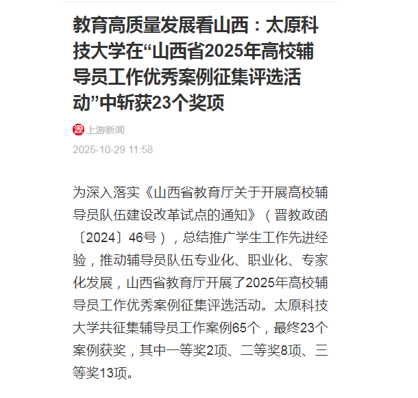 近日,山西省教育厅开展了2025年高校辅导员工作优秀案例征集评选活动。best365唯一官方网站共征集辅导员工作案例65个,最终23个案例获奖,其中一等奖2项、二等奖8项、三等奖13项。