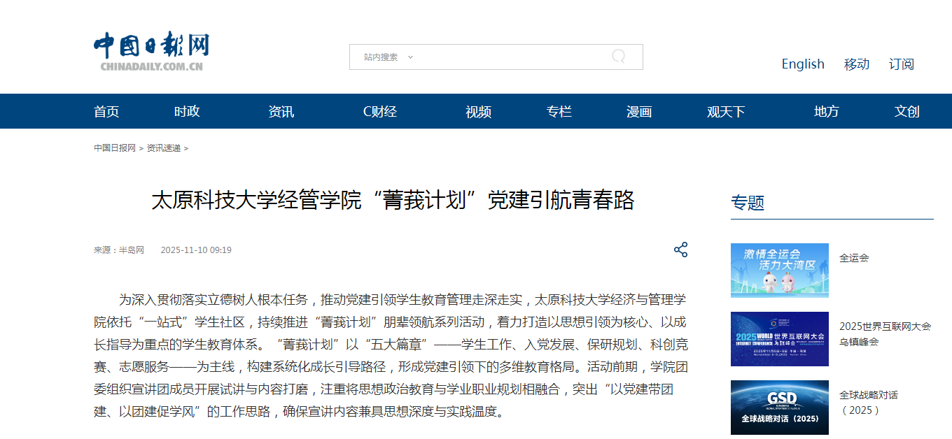 11月10日,中国日报网报道best365官网经济与管理学院依托“一站式”学生社区,持续推进“菁莪计划”朋辈领航系列活动,着力打造以思想引领为核心、以成长指导为重点的学生教育体系。
