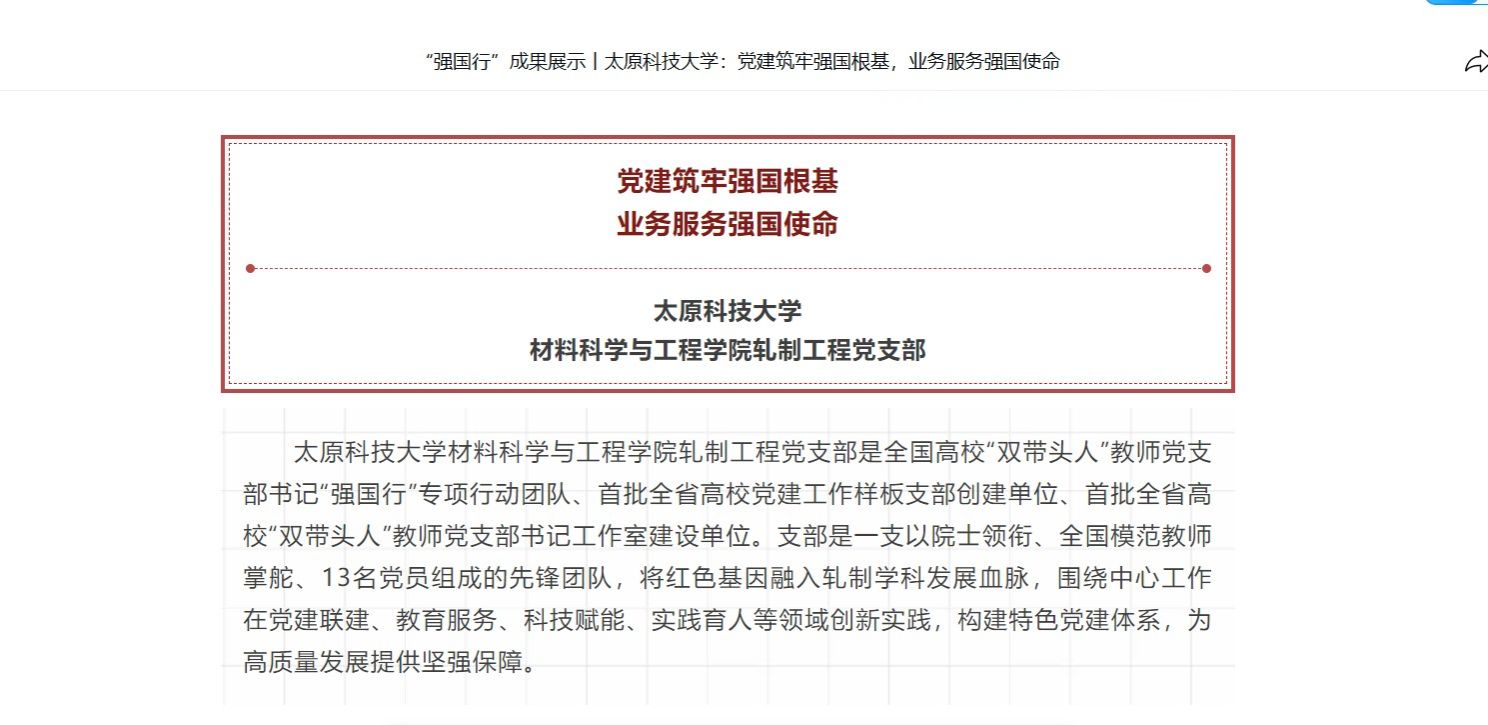 best365唯一官方网站材料科学与工程学院轧制工程党支部是全国高校“双带头人”教师党支部书记“强国行”专项行动团队、首批全省高校党建工作样板支部创建单位、首批全省高校“双带头人”教师党支部书记工作室建设单位。支部是一支以院士领衔、全国模范教师掌舵、13名党员组成的先锋团队,将红色基因融入轧制学科发展血脉,围绕中心工作在党建联建、教育服务、科技赋能、实践育人等领域创新实践,构建特色党建体系,为高质量发展提供坚强保障。近日,全国高校思想政治工作网对此进行了报道。