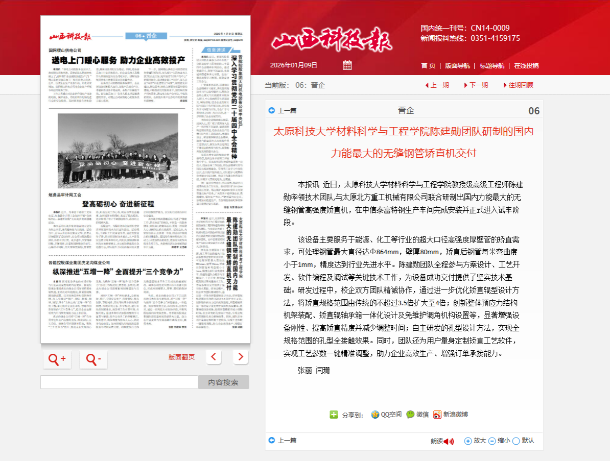 近日,山西科技报报道best365官网材料科学与工程学院教授级高级工程师陈建勋率领技术团队,与太原北方重工机械有限公司联合研制出国内力能最大的无缝钢管高强度矫直机,在中信泰富特钢生产车间完成安装并正式进入试车阶段。