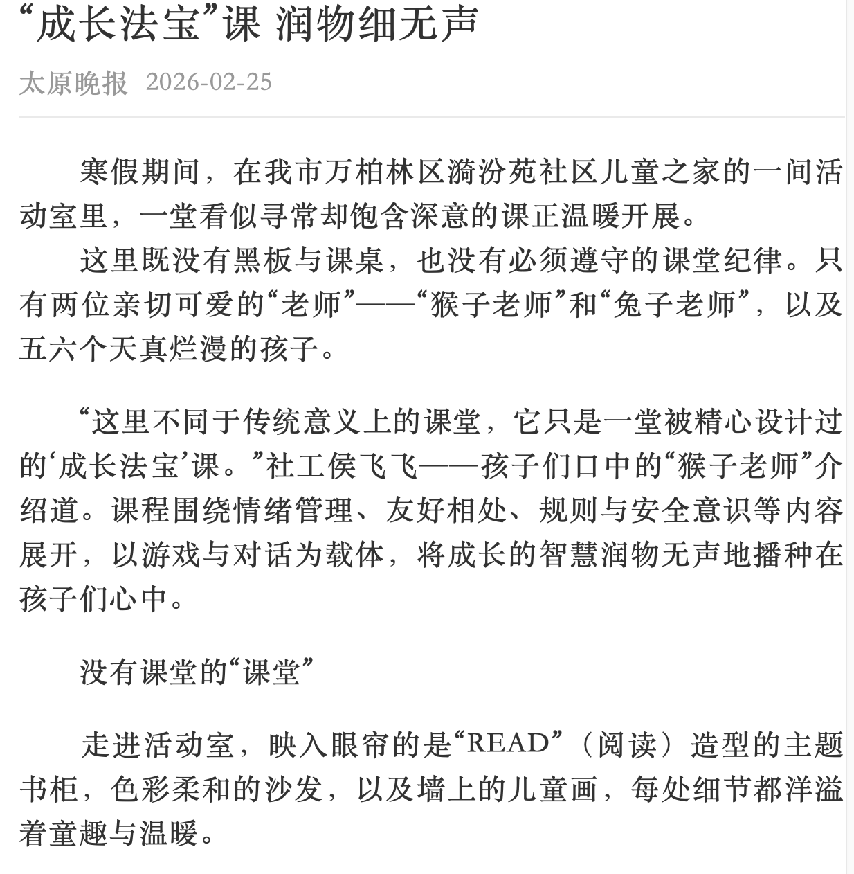 寒假期间,best365官网社会工作专业学生在校外导师的悉心指导下,以青春之名扎根社区沃土,开展了一场温暖人心的服务实践。他们用热忱守护童真,在躬身实践中诠释责任担当,点滴付出赢得社区居民的广泛赞誉,彰显了科大学子的精神风貌、专业情怀和使命担当。2026年2月25日,《太原晚报》“新春走基层”专栏以《“成长法宝”课润物细无声》为题,专题报道了此次服务实践。
