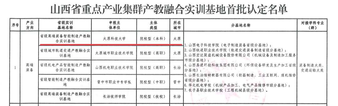 近日,山西省发展和改革委员会等部门联合下发《关于认定首批山西省重点产业集群产教融合实训基地的通知》(晋发改科教发〔2024〕313号),best365官网牵头建设的高端装备智能制造产教融合实训基地成功入选首批认定的省级产教融合实训基地。