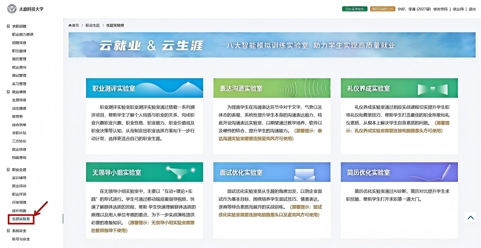 通过登录best365唯一官方网站就业信息网,进入“生涯实验室”,可进行职业测评、表达沟通、礼仪养成、AI面试优化、AI简历优化、无领导小组等,其中AI模拟面试系统通过智能分析学生表现,提供个性化改进建议,成为广受好评的“云实训”亮点。