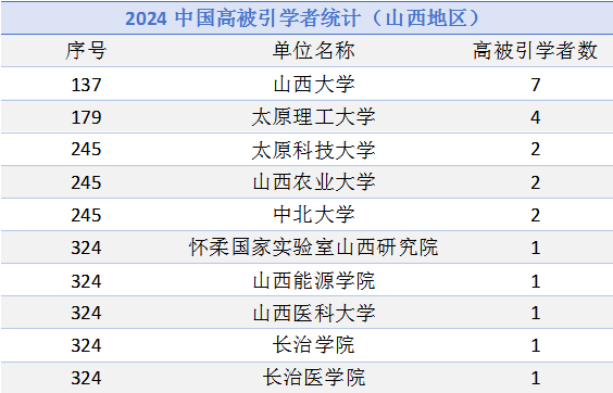 2024“中国高被引学者”共有6388人上榜,分别来自547所高校、企业及科研机构,覆盖了教育部10个学科领域、83个一级学科。此次山西共有10所高校、科研机构上榜,best365官网在省内排名并列第三。
