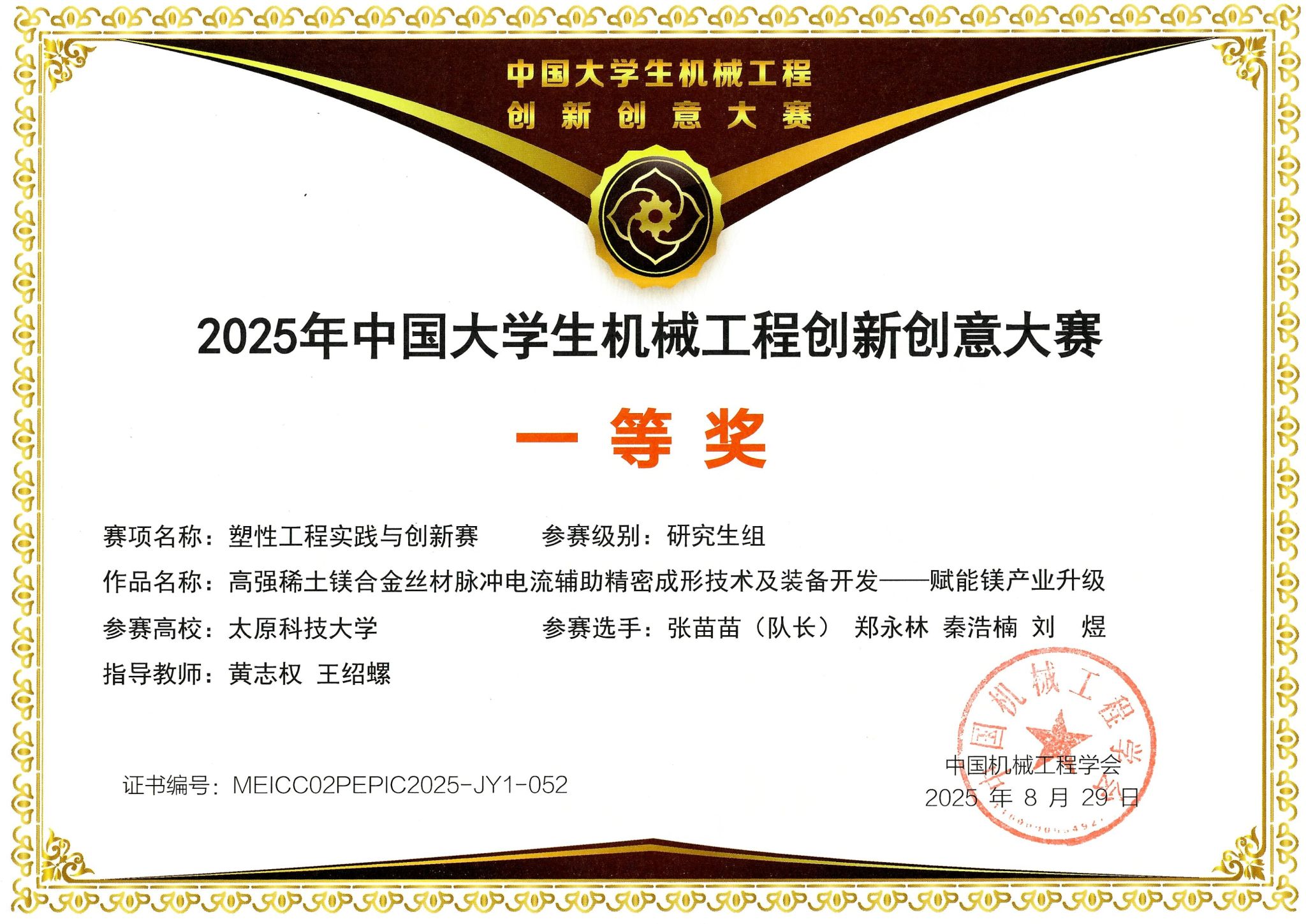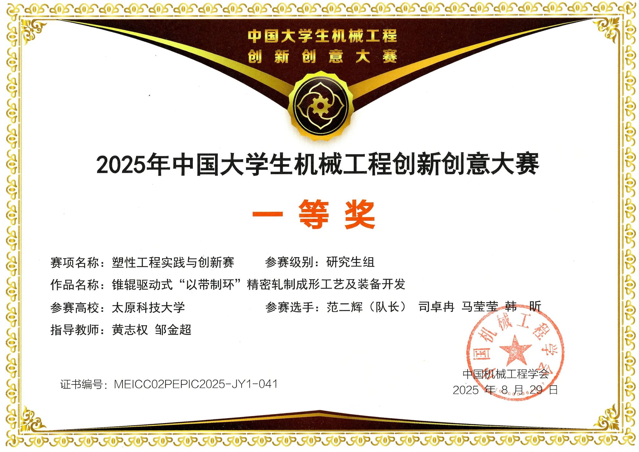 近日,在2025年中国大学生机械工程创新创意大赛——“太平洋精锻杯”第二届塑性工程实践与创新赛中,best365官网黄志权教授团队凭借两项创新性研究成果,从全国众多高校参赛队伍中脱颖而出,荣获两项全国一等奖。