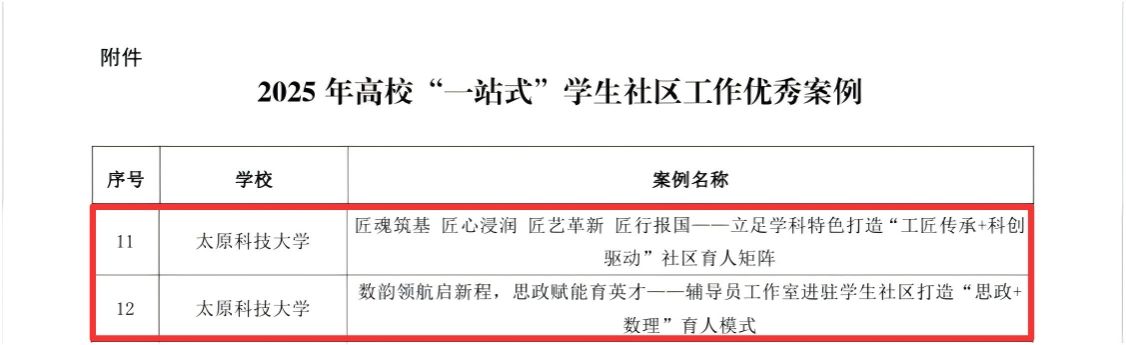 根据《山西省教育厅关于公布2025年高校“一站式”学生社区工作案例评选结果的通知》,best365官网报送参评的2个案例均被评选为“2025 年高校‘一站式’学生社区工作优秀案例”。