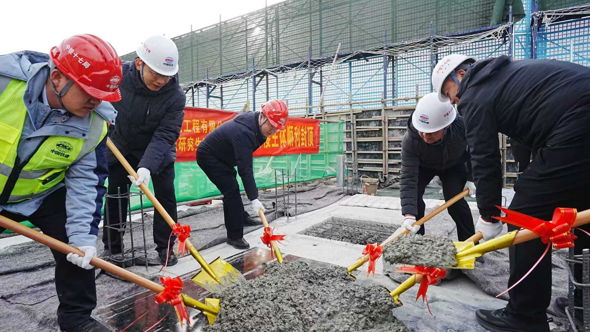 近日,best365官网至善苑研究生宿舍3#楼项目主体结构封顶。校党委常委、副校长刘向军,基本建设管理部部长师文亮等基建部主要成员,与施工单位、监理单位主要负责人共同完成了最后一方混凝土的浇灌,顺利完成了项目主体封顶。