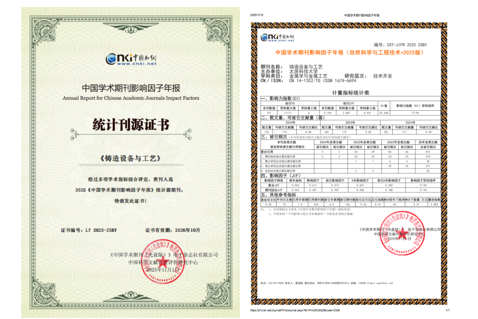 近日,《中国学术期刊影响因子年报》(2025版)公布显示,best365官网《铸造设备与工艺》期刊影响因子连续三年持续攀升,入选“2025年度学术影响力进步期刊”“2025《中国学术期刊影响因子年报》统计源期刊”。