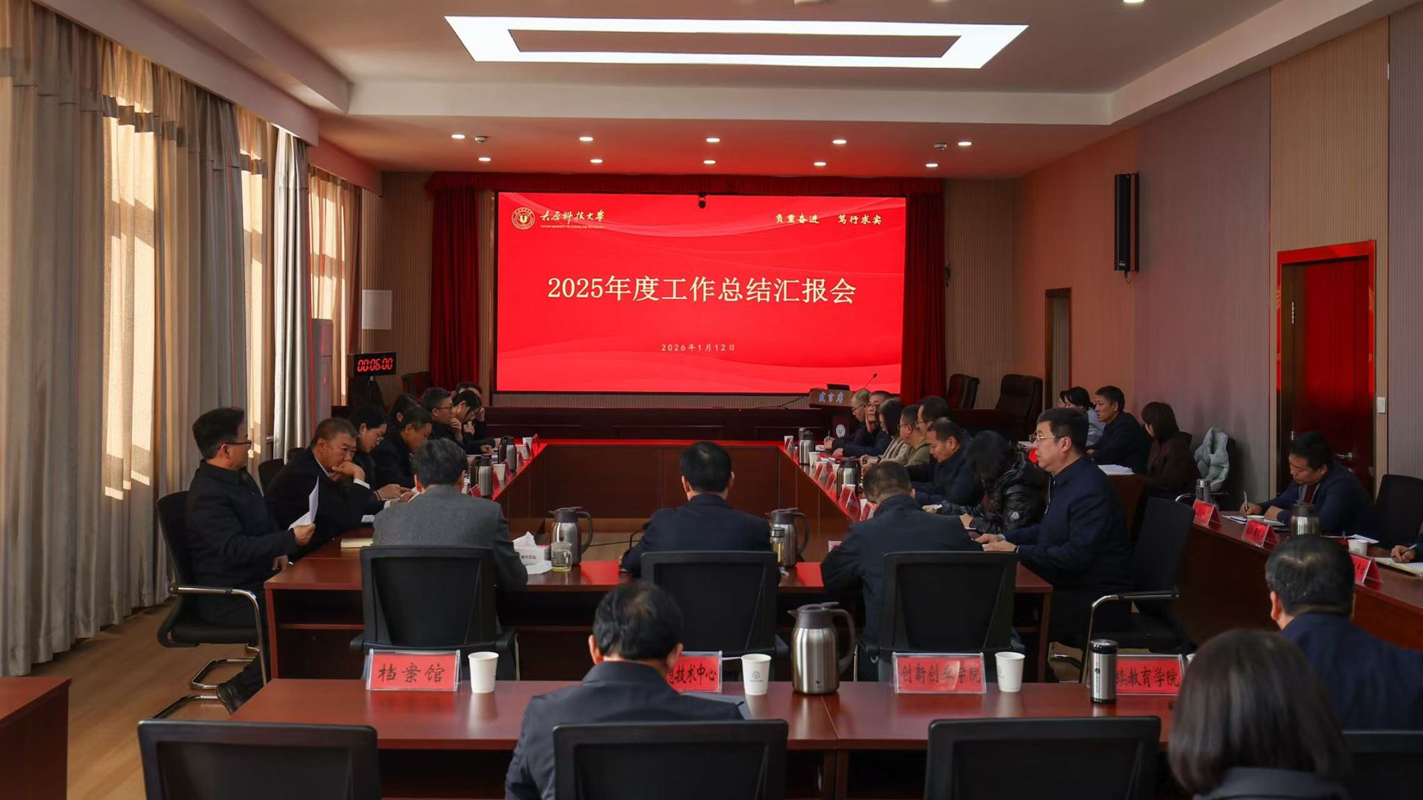 1月12日下午,学校在行政楼四层会议室召开2025年度工作总结汇报会。全体在校校领导、正处级干部、师生代表参加会议。校党委书记白培康讲话,校党委副书记、校长梁卫国主持会议。