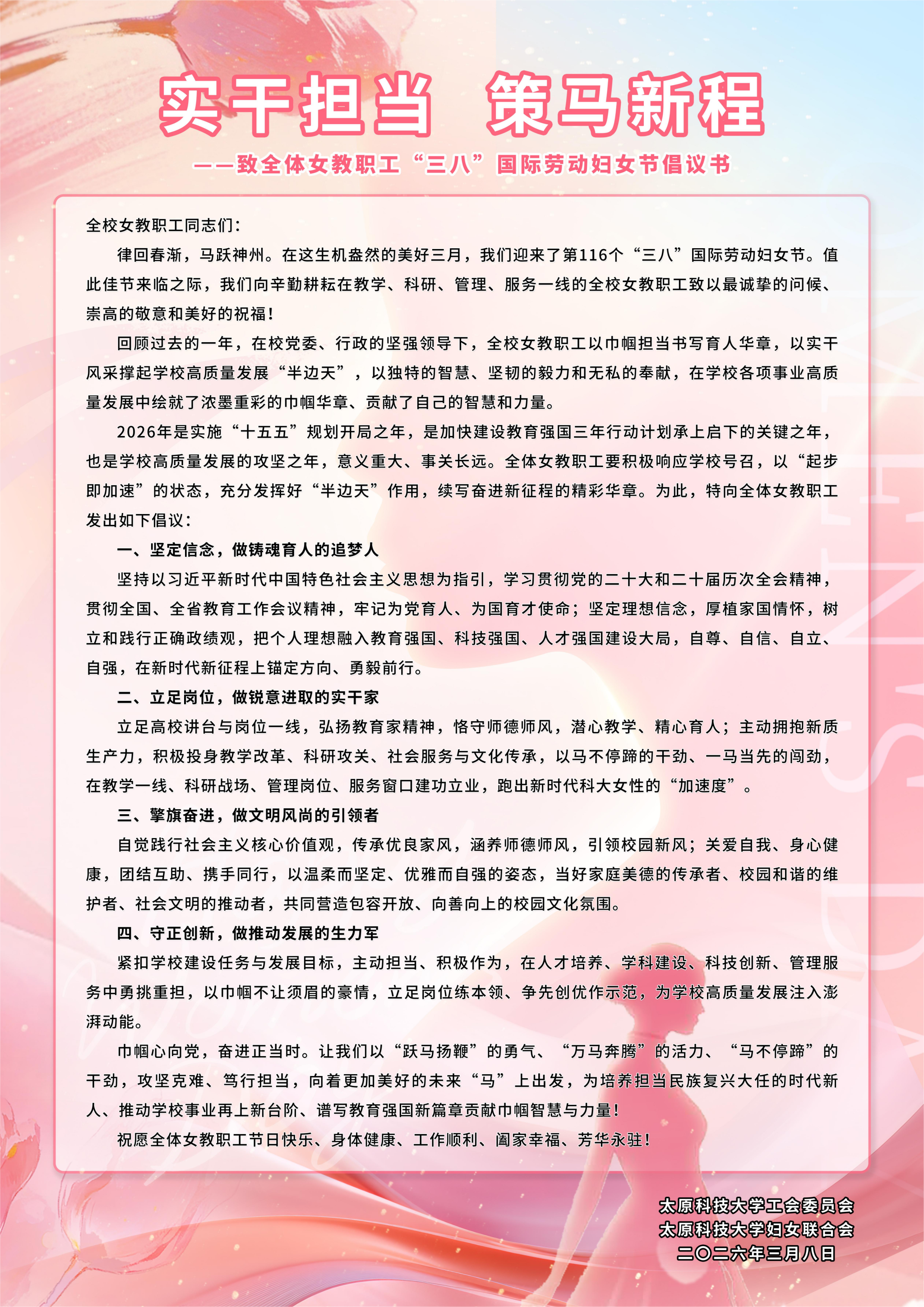实干担当 策马新程——致全体女教职工“三八”国际劳动妇女节倡议书
